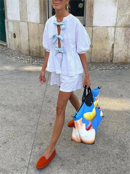 Blue Bow Striped Blouse Set