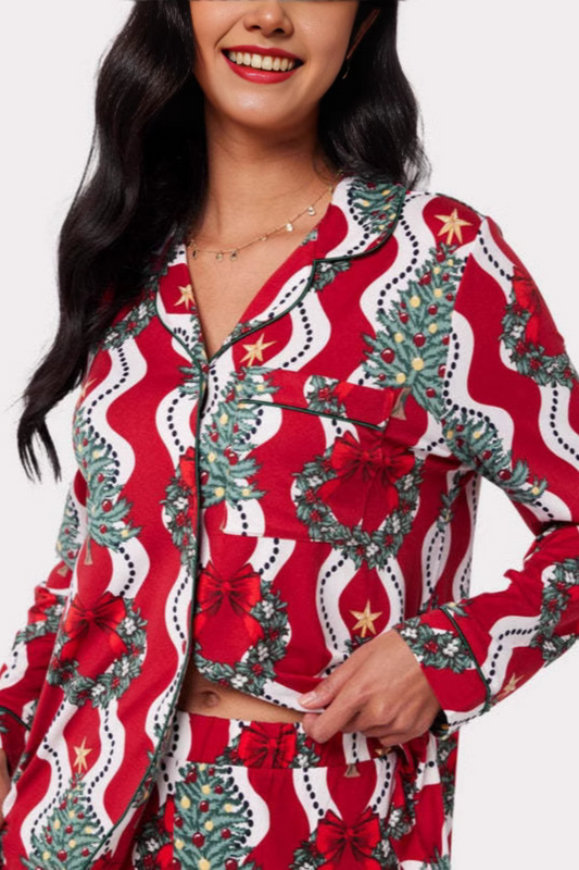 Fashionable Christmas Holiday Lapel Neck Bow Neck Women Pajams Set