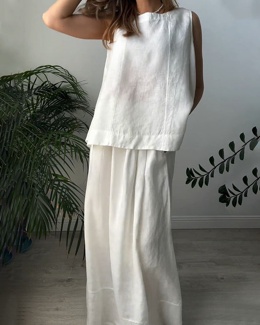 Cotton and Linen Sleeveless Tie-Strap Shirt Long Dress Set