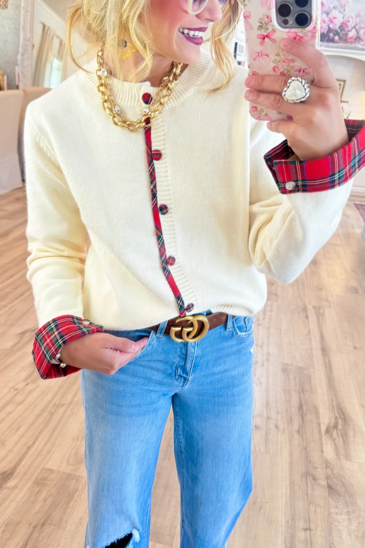 Chic and versatile, this cream - colored cardigan boasts a lovely design with plaid accents on the cuffs and front placket. The soft knit fabric ensures comfort, while the button - down style adds a touch of classic charm. Perfect for layering over tees or blouses, it effortlessly elevates your everyday outfits with a hint of preppy flair.