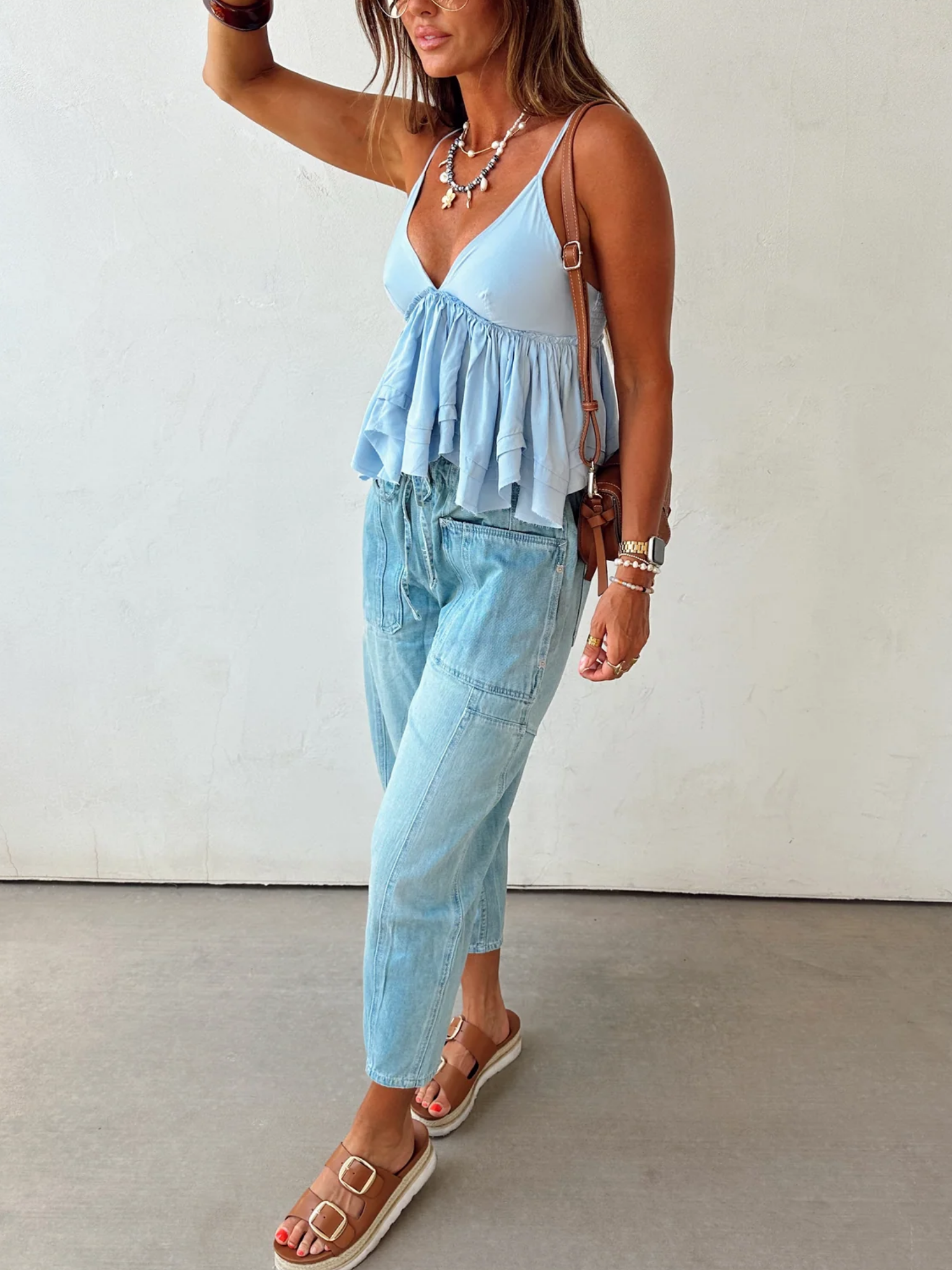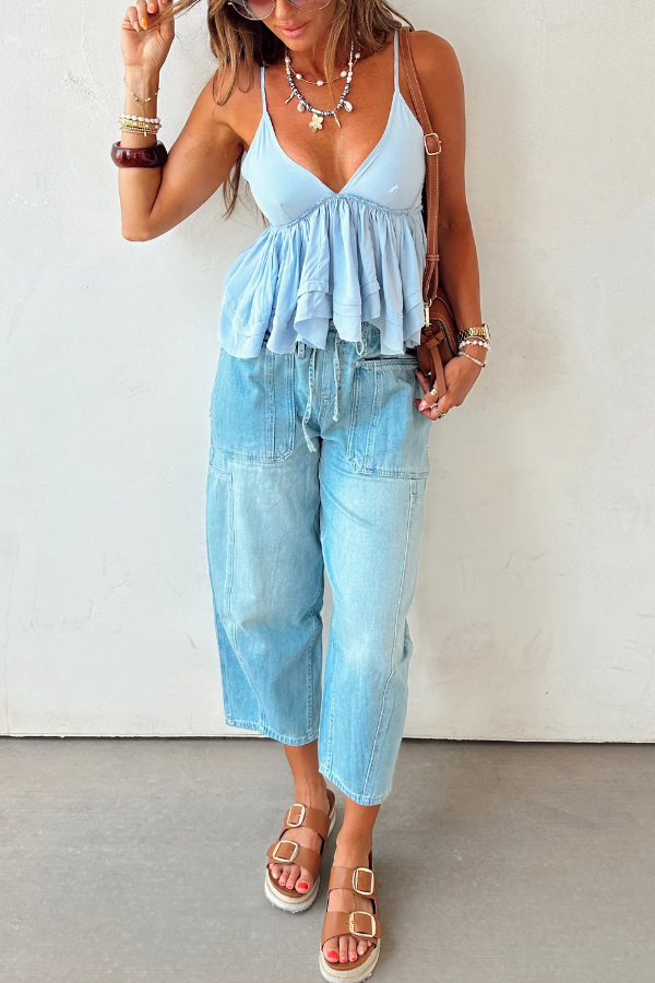 Flowy tiered babydoll silhouette for a soft, romantic look,Lightweight and breathable fabric—perfect for warmer days,Adjustable spaghetti straps for a customizable fit,Deep V-neckline adds a touch of flirty femininity